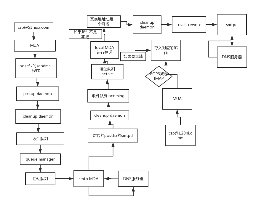120ni.com域的邮件服务器同样运行postfix(或者是其他符合标准的MTA),服务器上的postfix smtpd收下51niux.com域下的csp用户通过smtp MDA发来的邮件。